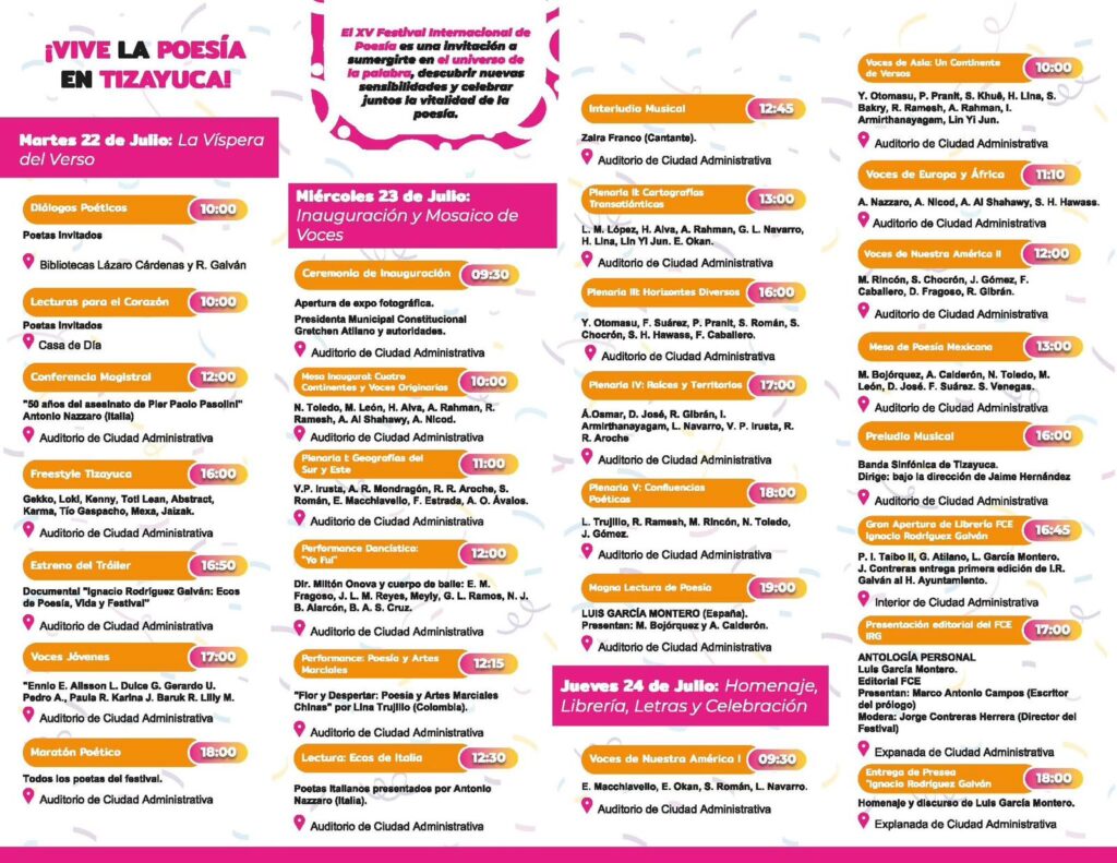 “Invito a todas y todos a vivir este encuentro con la poesía y con el mundo. Es una experiencia única, profunda y festiva, que celebra la palabra, la diversidad y la resistencia cultural”, concluyó el director.