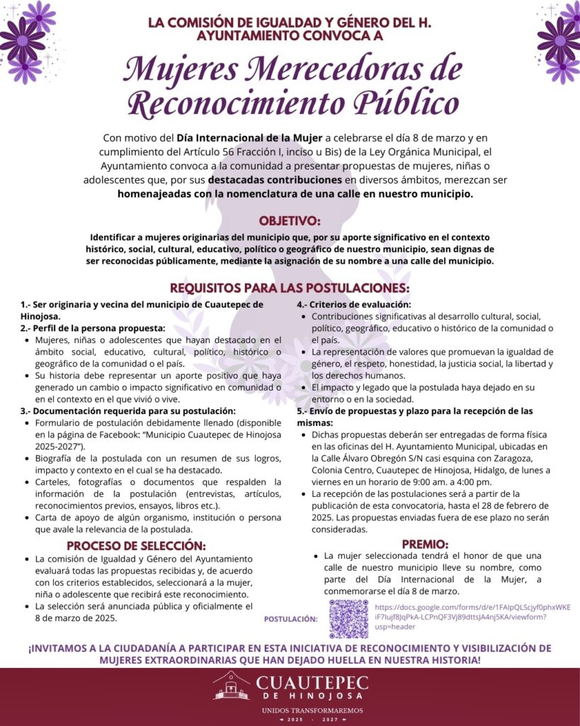 Con motivo del Día Internacional de la Mujer, que se conmemora el 8 de marzo, el Ayuntamiento de Cuautepec de Hinojosa emitió una convocatoria a la comunidad para presentar propuestas de mujeres, niñas y adolescentes que, por sus notables contribuciones en diversos ámbitos, merezcan ser homenajeadas con la nomenclatura de una calle en el municipio.