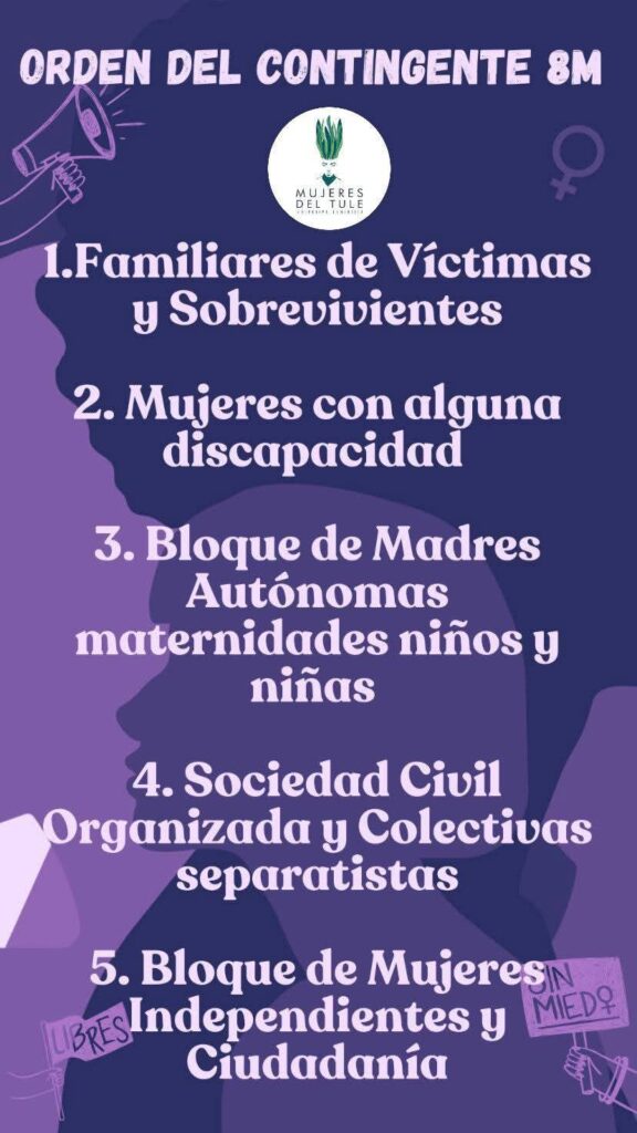 El contingente tendrá un orden específico: primero familiares de víctimas y sobrevivientes; después mujeres con alguna discapacidad; seguido del bloque de madres autónomas y maternidades con niños y niñas; posteriormente sociedad civil organizada y colectivas separatistas, finalmente mujeres independientes y ciudadanía en general.