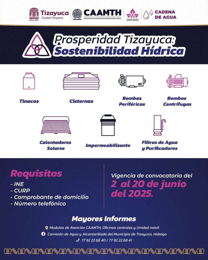 Desde el 2 de junio y hasta el próximo viernes 20 de junio, las familias de Tizayuca tienen la oportunidad de registrarse en la segunda convocatoria del programa “Prosperidad Tizayuca Sostenibilidad Hídrica”. Esta iniciativa, que se lleva a cabo en colaboración con la Congregación Mariana Trinitaria, busca mejorar la calidad de vida de los tizayuquenses mejorando el acceso a insumos que permitan el almacenamiento limpio y seguro del agua potable, a través de la adquisición de tinacos, cisternas, calentadores solares, filtros de agua y purificadores, impermeabilizantes, además de bombas periféricas y centrífugas.