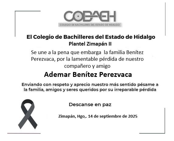 Lamentamos profundamente la irreparable pérdida de nuestro compañero y amigo Ademar Benítez Perezvaca, del Plantel Zimapán II. Enviamos nuestras más sinceras condolencias y solidaridad a sus familiares y amigos, deseándoles fortaleza en este difícil momento.