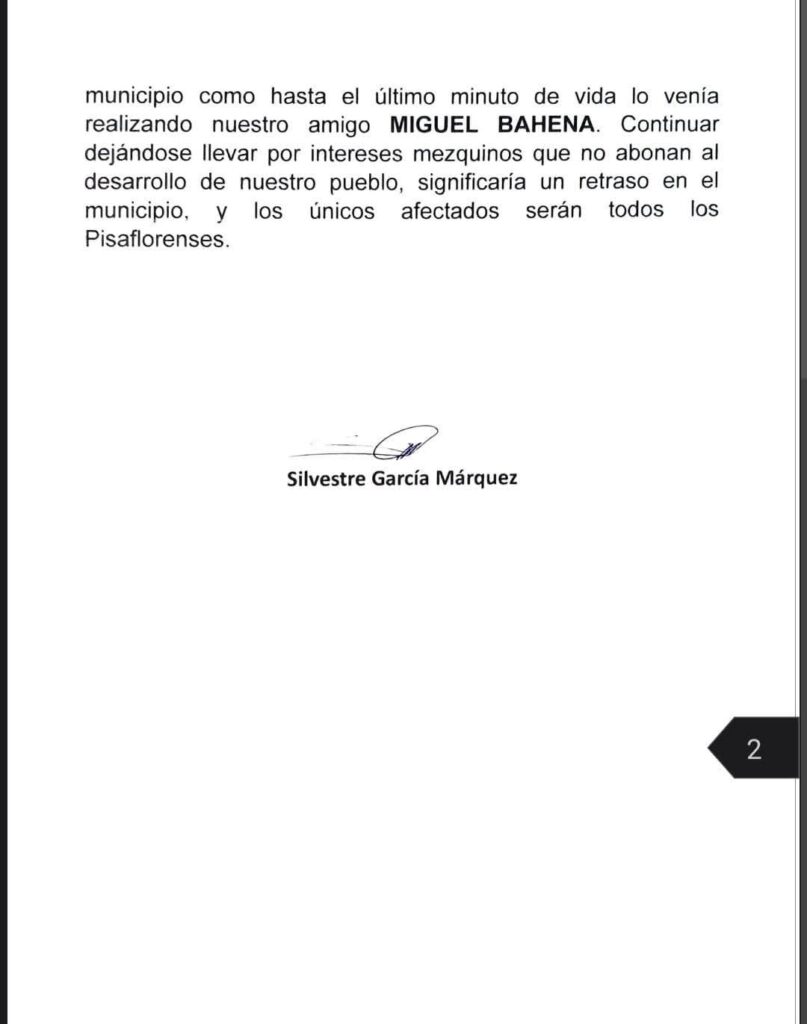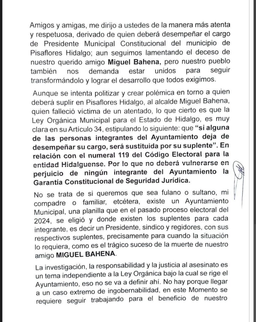 En el escrito, García Márquez aprovechó para desestimar la petición de María Fernanda Martínez, viuda de Miguel Bahena, quien hace apenas unos días pidió ante el cabildo que fuera su cuñado Guadalupe Bahena Solórzano quien continúe al frente de la administración.