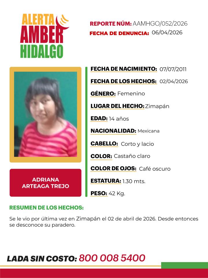 Adriana fue vista por última vez el 2 de abril de 2026 en Zimapán. La denuncia correspondiente fue radicada el 06 de abril de 2026, activándose de inmediato los protocolos de búsqueda de Alerta Amber para agilizar su localización.