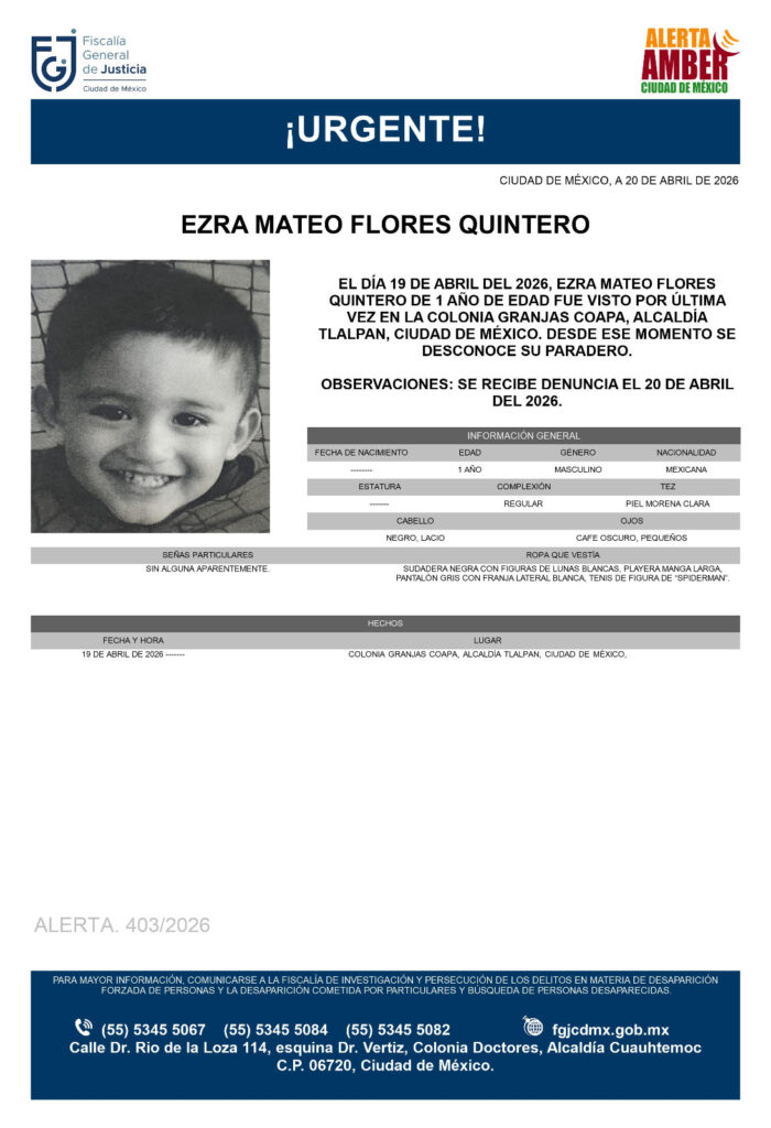 La búsqueda de Ezra Mateo Flores Quintero ha encendido las alertas en la capital del país, luego de que se activara una Alerta Amber para dar con el paradero del menor de apenas 1 año de edad, quien fue visto por última vez en la alcaldía Tlalpan, en la Ciudad de México.