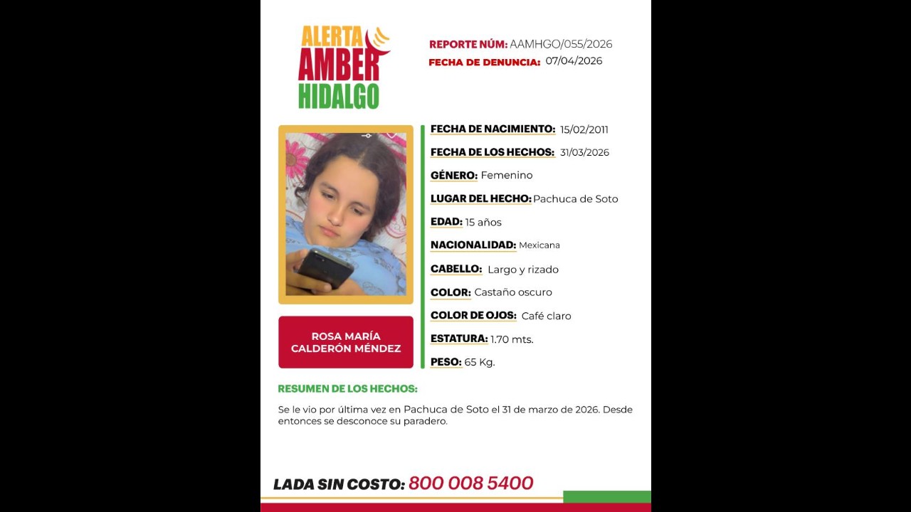 La Procuraduría General de Justicia del Estado de Hidalgo activó una Alerta Amber para localizar a Rosa María Calderón Méndez, una joven de 15 años desaparecida en el municipio de Pachuca.