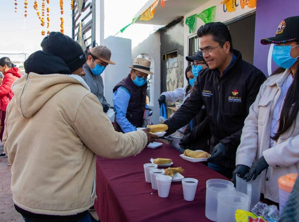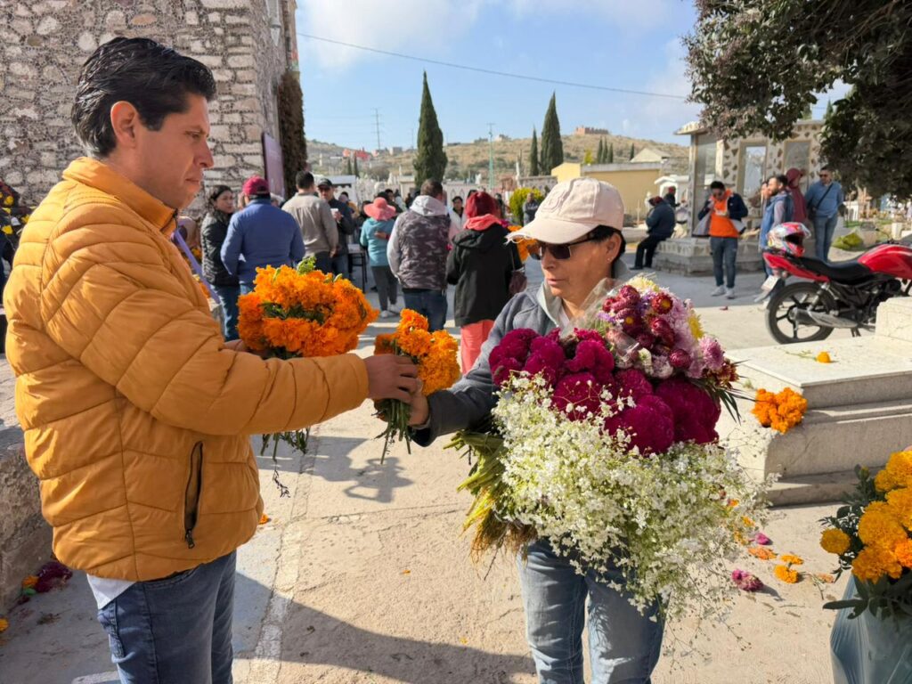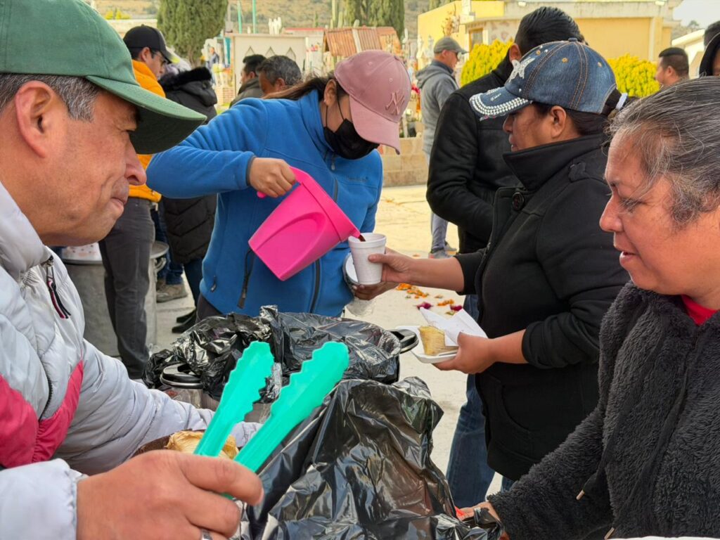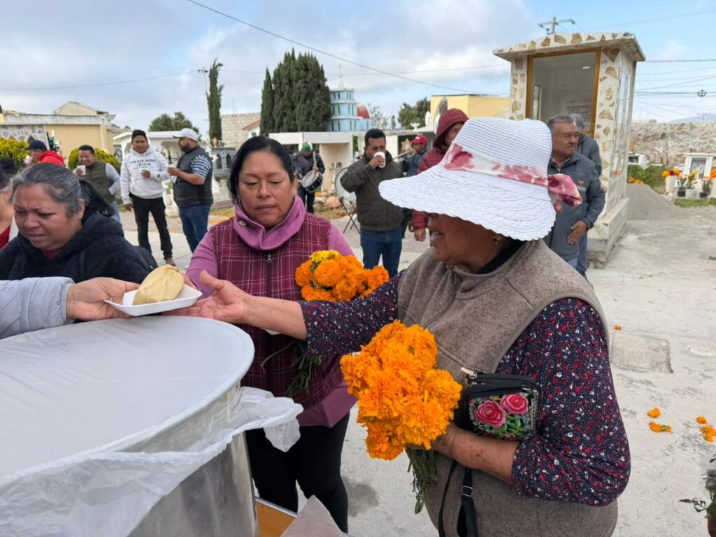 En el panteón de Azoyatla, personal encabezado por el secretario general del Ayuntamiento, Jesús Escamilla Baños, junto con otros funcionarios municipales, también distribuyó alimentos, café y flores entre los asistentes.