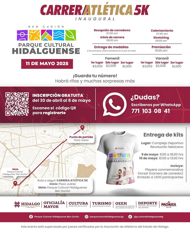 Con motivo de la inauguración del Parque Cultural Hidalguense “Ben Gurión”, autoridades estatales han anunciado la Carrera Atlética 5K, a celebrarse el próximo 11 de mayo de 2025, con inscripción gratuita y premios en efectivo para los primeros lugares.