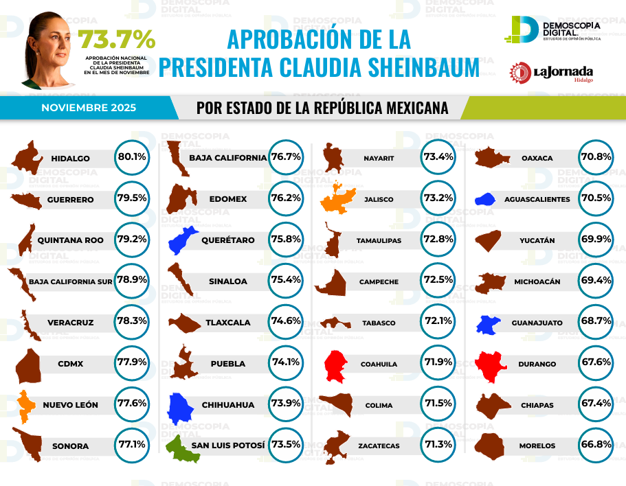 En el análisis por entidad federativa, Hidalgo encabeza la lista con 80.1% de aprobación, seguido de Guerrero (79.5%), Quintana Roo (79.2%), Baja California Sur (78.9%) y Veracruz (78.3%). Todas estas entidades superan el 78 por ciento.