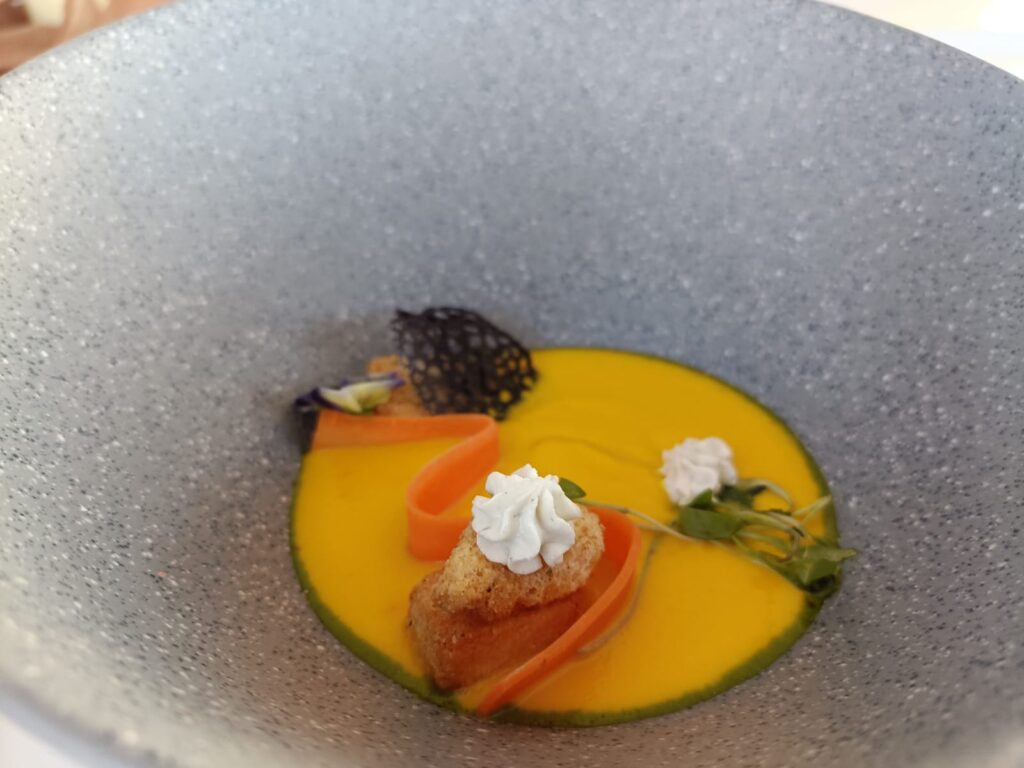 El segundo tiempo, denominado “Alma del mezquital”, ofreció una crema de zanahoria. El plato fuerte se llamó “Aliento de la tierra”, en el que las y los asistentes degustaron barbacoa y consomé de conejo, con tortillas hechas a mano con maíz criollo y salsa de xoconostle y xamues.