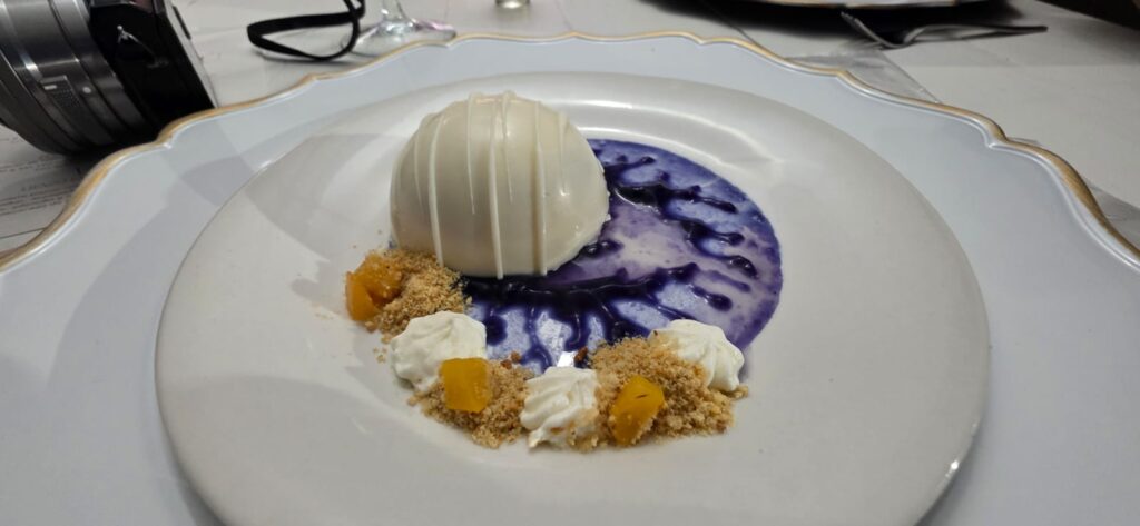 Además, se degustó un pre-postre en donde los ingredientes principales fueron la jamaica y el garambullo. Y en el postre, una esfera de chocolates blanco relleno de mousse de vainilla con duraznos en almíbar.