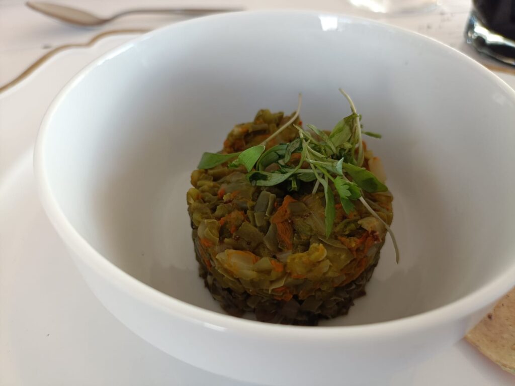 Por eso, en el primer tiempo se ofreció un platillo denominado “Manos en el Valle”, que se conformó por una tostada en la que se pintó un mezquite, ya sea con ceniza de totomoxtle o tintura vegetal proveniente de los alimentos, en donde se incluyó champiñones, nopales, flor de calabaza y sal de gusano.