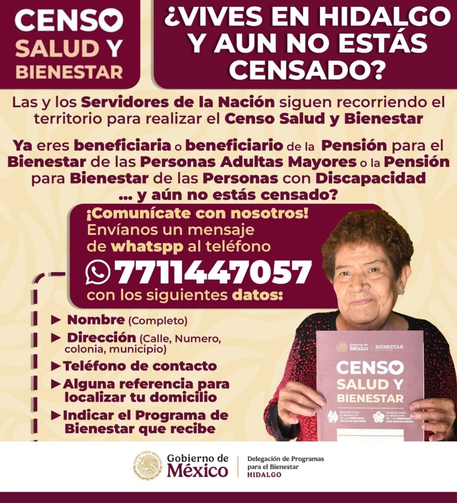 Según comentó el delegado de Programas para el Bienestar en Hidalgo, es posible que las personas adultas mayores que aún no han sido censadas salgan a trabajar y regresen tarde a sus hogares, por eso, se está pidiendo que escriban al 771 144 7057 y pidan una cita en un horario que les convenga.