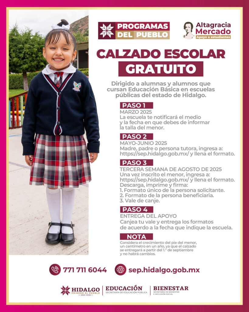 El programa Calzado Escolar Gratuito beneficiará a alumnas y alumnos de educación básica en escuelas públicas de Hidalgo. Para acceder a este apoyo, madres, padres o tutores deberán seguir un proceso de registro y entrega de documentos.