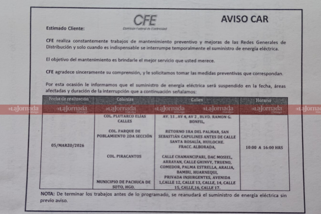 La Comisión Federal de Electricidad (CFE) informó a vecinos de diversas colonias de Pachuca sobre la suspensión temporal del suministro eléctrico debido a trabajos de mantenimiento y mejora en las redes de distribución.