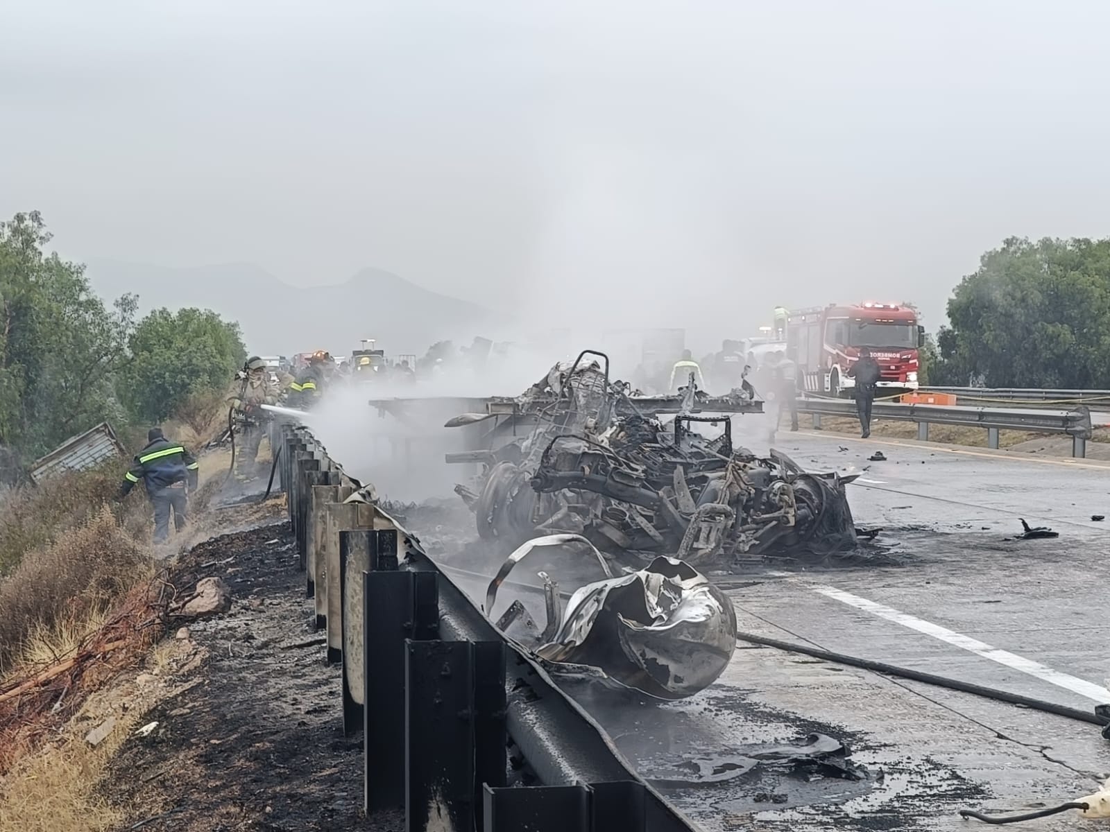 Según los datos preliminares, el chófer del tráiler que se incendió falleció calcinado al interior de su unidad, mientras que una segunda persona quedó muerta sobre la autopista.