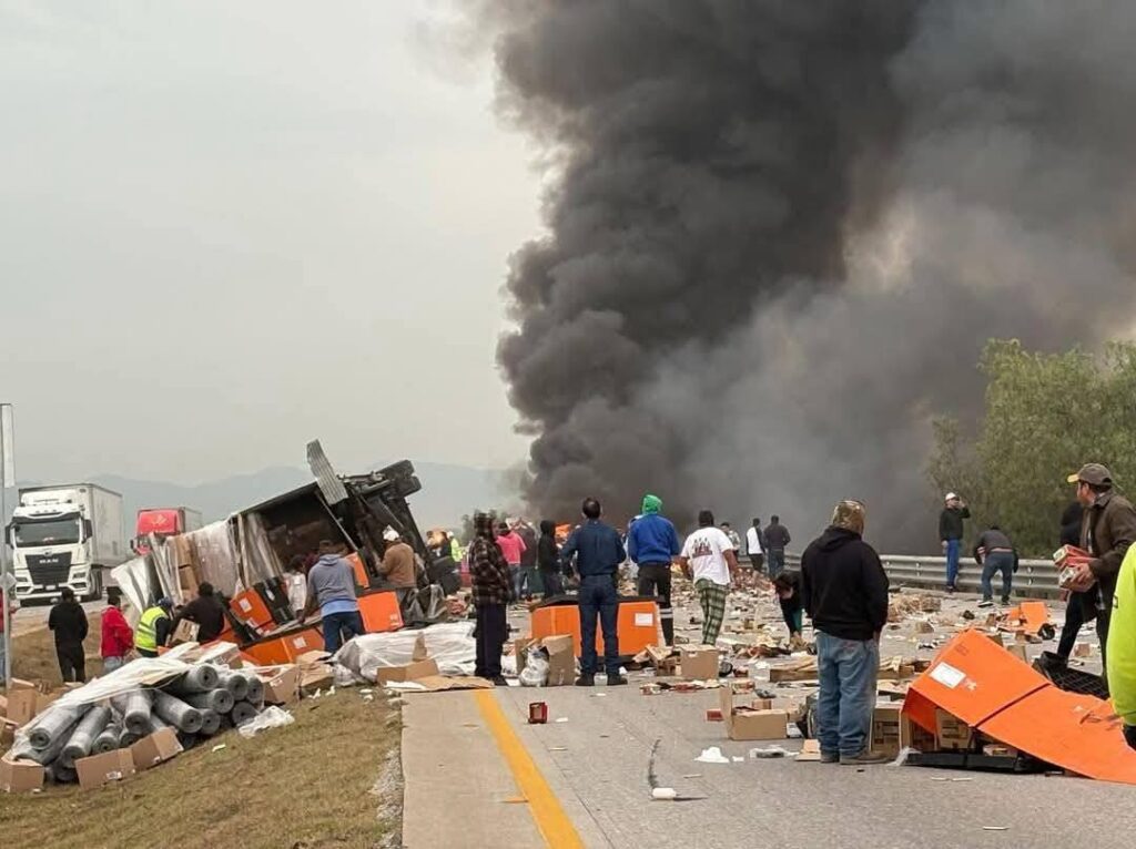 La carga de uno de los tráileres quedó tirada sobre la Arco Norte, se trata de herramientas y otros productos similares, por lo que se informó rapiña de personas en la vialidad de cobro.