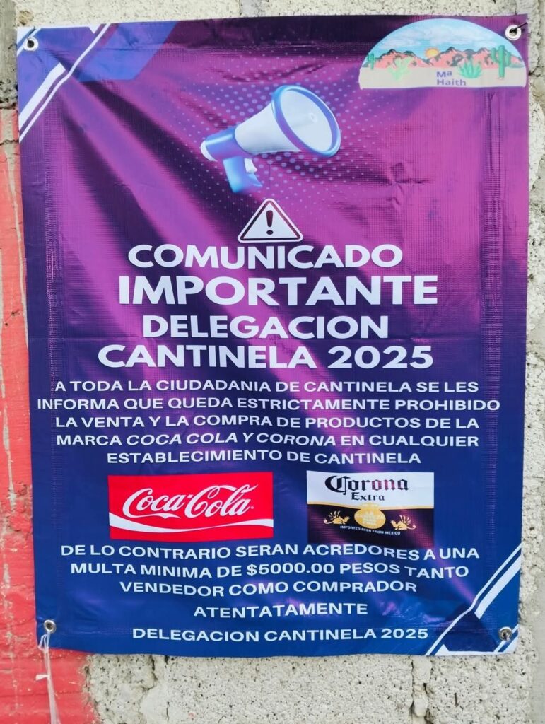 Lo anterior quedo manifestado a través de una lona que fue colocada a las afueras de la delegación municipal, en la que se especificó que la compra y venta de estos productos de la empresa refresquera y cervecera estarán estrictamente prohibidos en todos los establecimientos de la localidad.