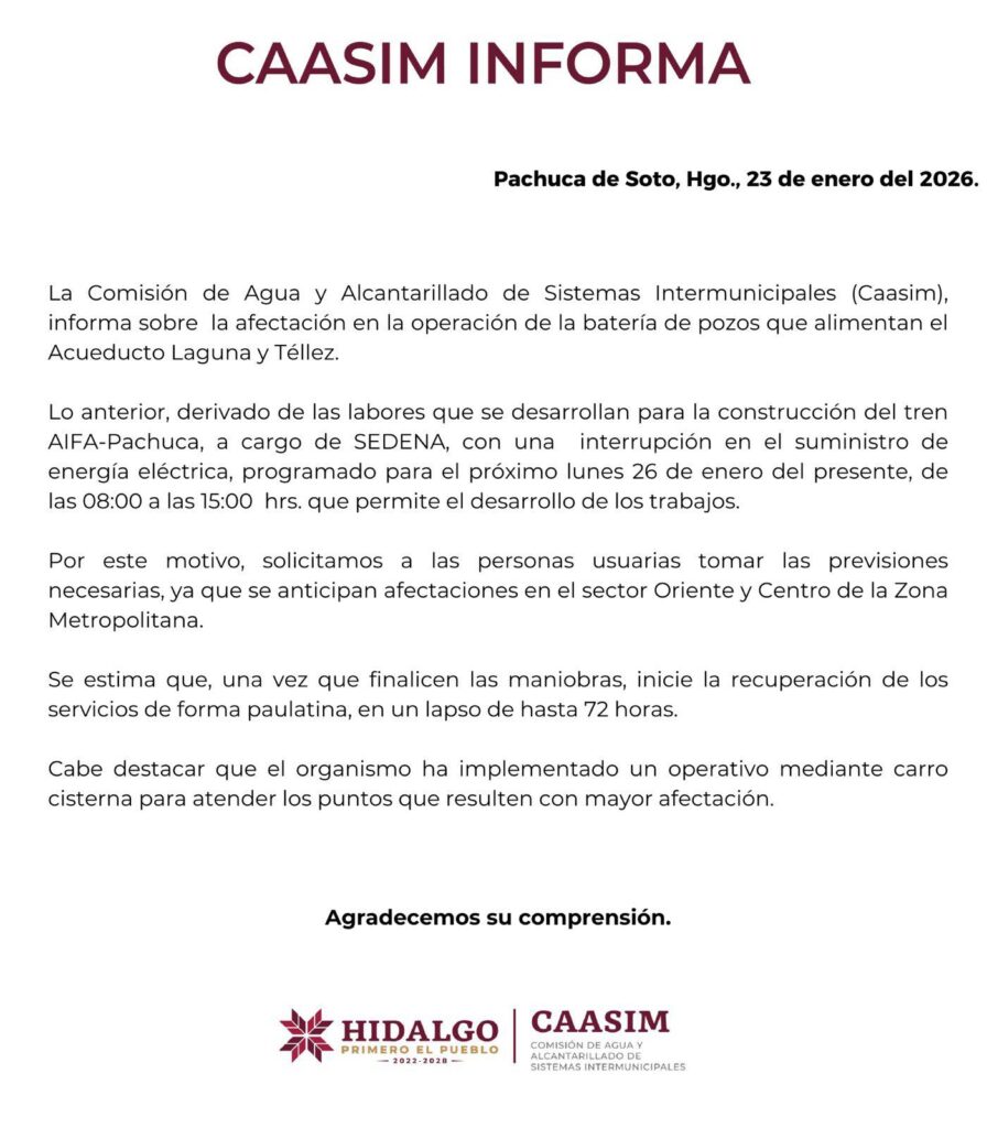La Comisión de Agua y Alcantarillado de Sistemas Intermunicipales (Caasim) informó que se registrarán afectaciones en el suministro de agua potable en Pachuca y la zona metropolitana, debido a trabajos relacionados con la construcción del tren AIFA–Pachuca.