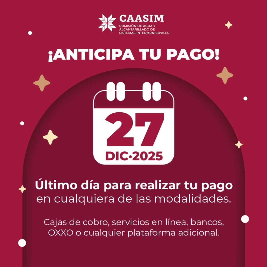 La Comisión de Agua y Alcantarillado de Sistemas Intermunicipales (Caasim) informó que el próximo sábado 27 de diciembre será el último día para que las y los usuarios realicen el pago correspondiente al servicio de agua potable, antes del cierre administrativo de fin de año.