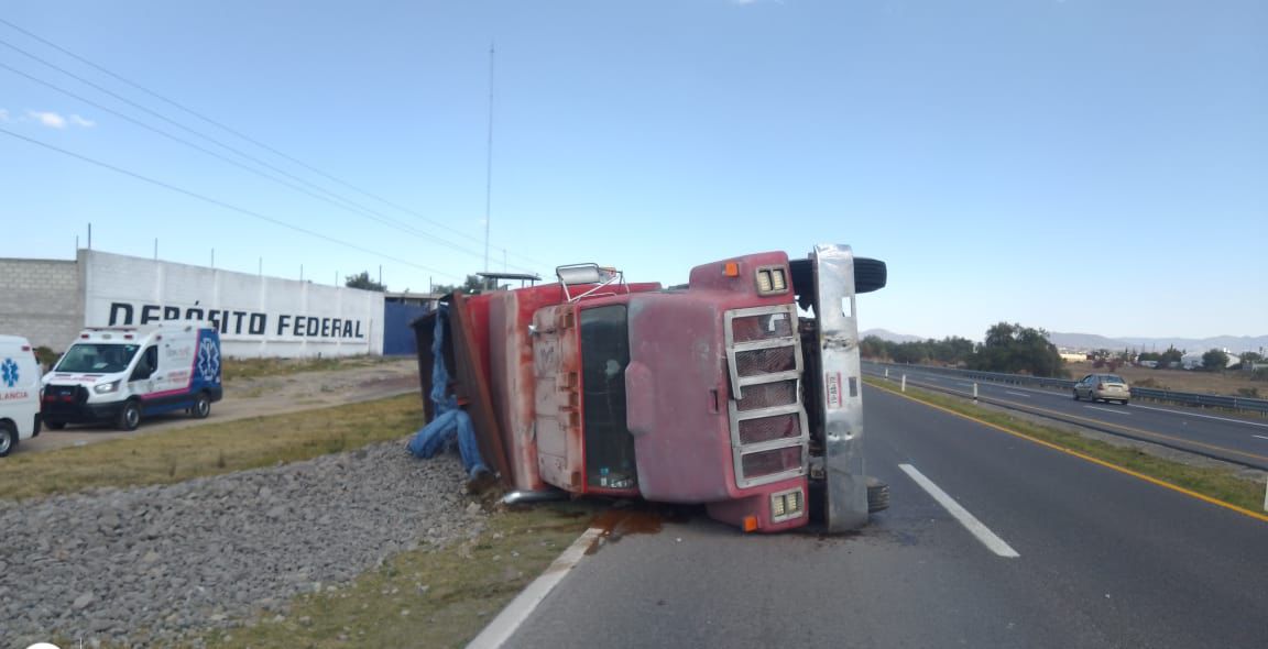 Esta tarde Un camión tipo volteó que transportaba material de construcción volcó en el kilómetro 36 de la autopista México-Tulancingo, a la altura del puente de Santo Domingo, en los límites del Estado de México con Hidalgo.