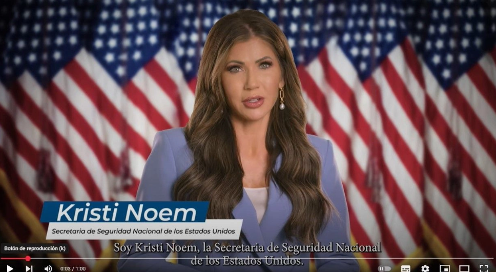 En el video, la funcionaria estadunidense señala: “Soy Kristi Noem, secretaria de Seguridad Nacional de los Estados Unidos. Gracias presidente Donald J. Trump por asegurar nuestra frontera, por deportar migrantes ilegales criminales y por poner a Estados Unidos primero.