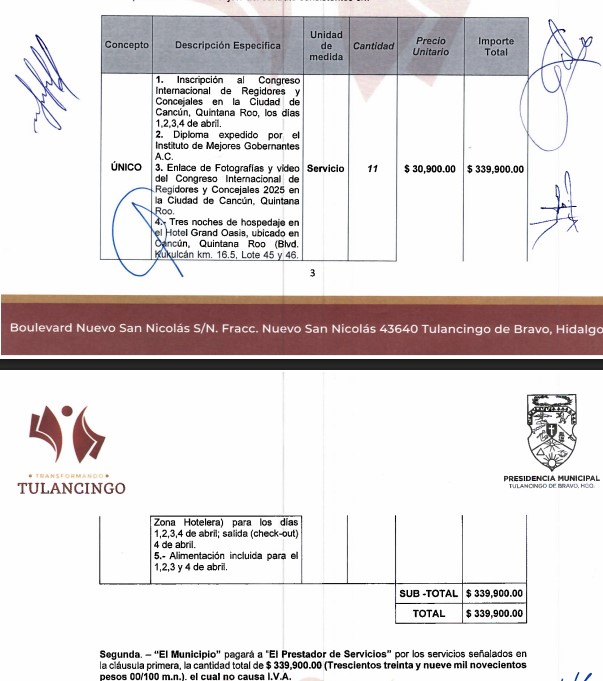 El costo total de la participación, que incluyó inscripciones, diplomas expedidos por el Instituto de Mejores Gobernantes, enlaces de fotografías y videos del Congreso, además de tres noches de hospedaje en el Hotel Grand Oasis y alimentación, ascendió a 339,900 pesos.