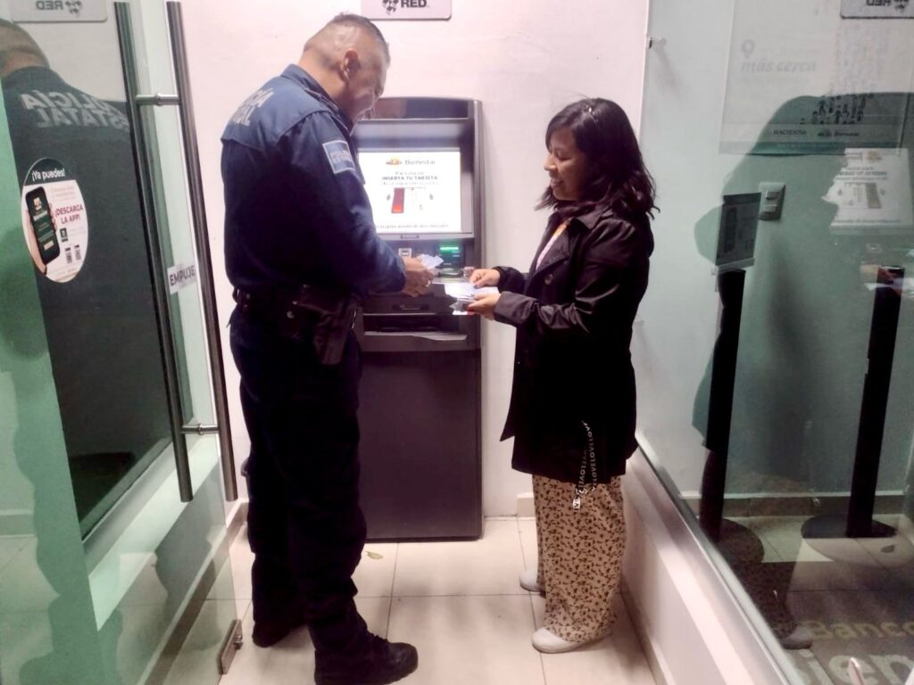 El incidente ocurrió cuando una mujer solicitó apoyo a los agentes, ya que al realizar una operación bancaria no recibió el efectivo correspondiente. Ante la situación, los elementos de la SSPH acudieron al lugar para verificar el problema.