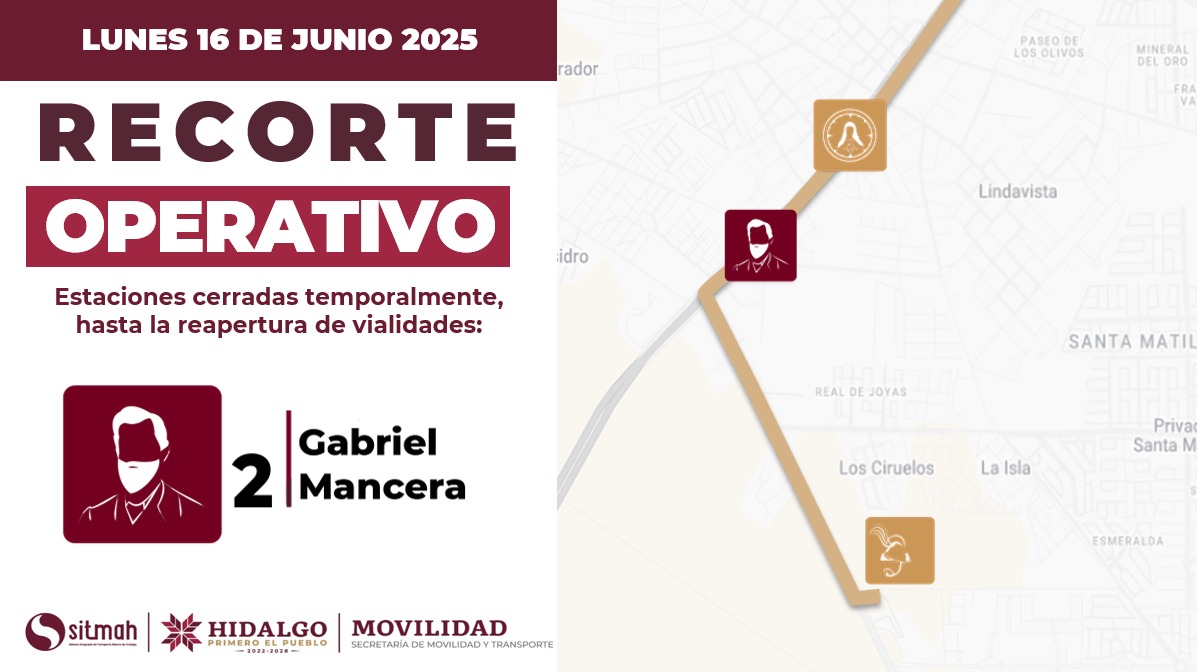 El Sistema de Transporte Tuzobús informó que, debido a labores de mantenimiento en el paso deprimido ubicado en la zona sur de Pachuca, la estación Gabriel Mancera permanecerá fuera de servicio de manera temporal a partir de las 12:00 horas de este lunes.