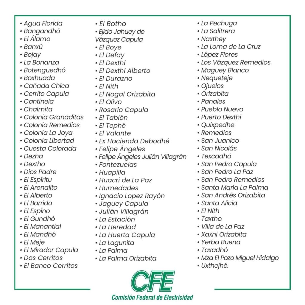 Desde la noche de este martes y hasta las primeras horas del miércoles, comunidades de Ixmiquilpan se quedarán sin energía eléctrica debido a que la red de distribución recibirá mantenimiento por parte del personal de la Comisión Federal de Electricidad (CFE).