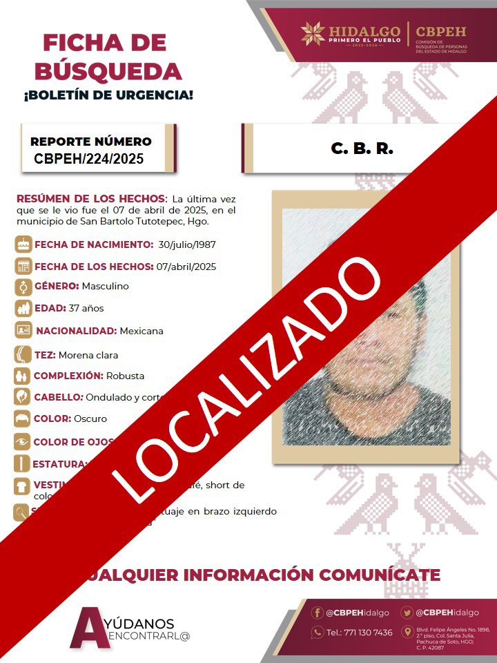 La Comisión de Búsqueda de Personas del Estado de Hidalgo (CBPEH) confirmó la localización sin vida de Cecilio B.R., quien había sido reportado como desaparecido el pasado 7 de abril en el municipio de San Bartolo Tutotepec.