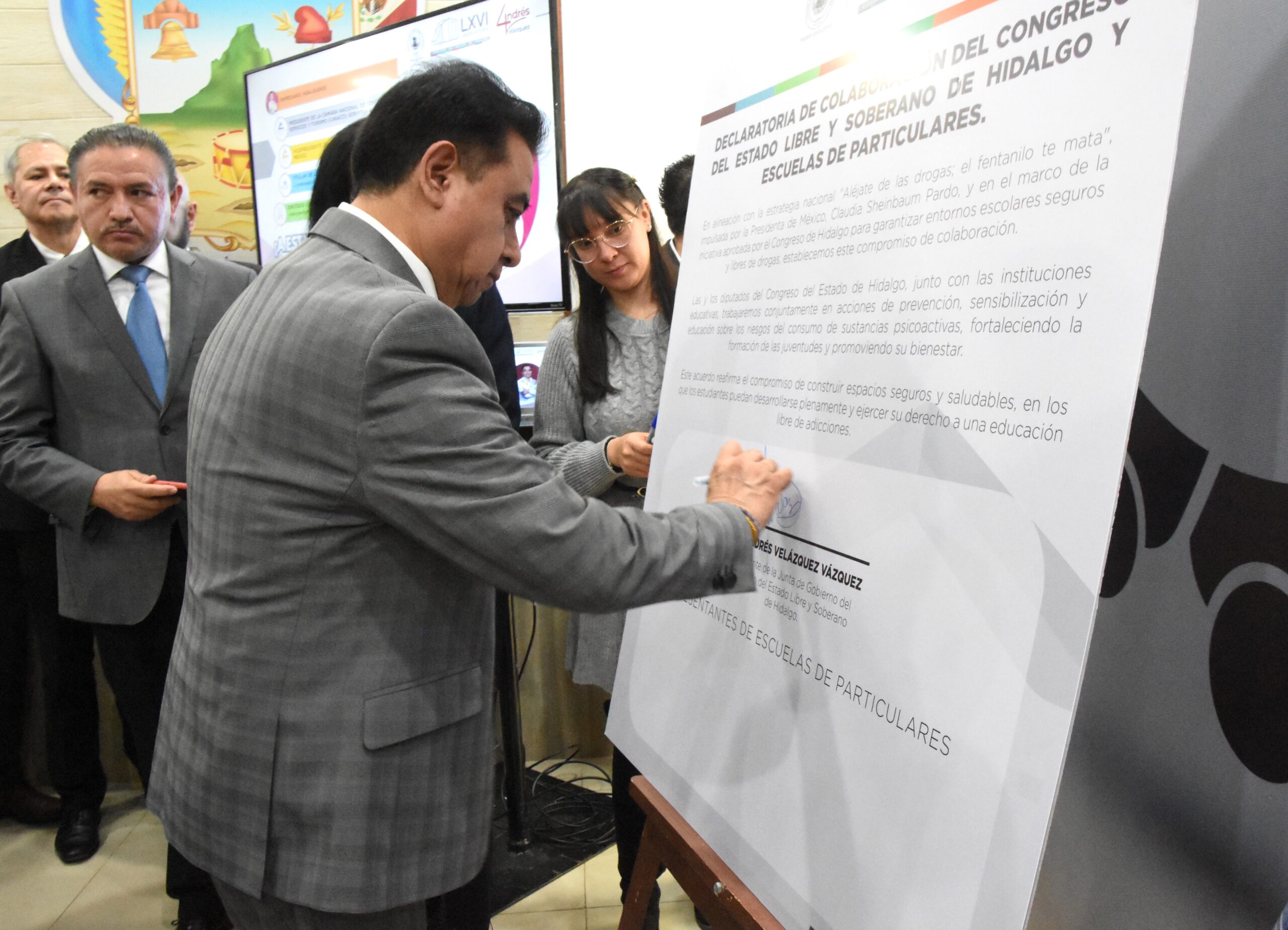 En alineación con la estrategia nacional “Aléjate de las drogas, el fentanilo te mata”, impulsada por la presidenta Claudia Sheinbaum, y tras la iniciativa aprobada en la LXVI Legislatura en la materia, el Congreso del Estado de Hidalgo firmó un convenio de colaboración con escuelas federales y particulares, con el fin de impulsar acciones de sensibilización y desarrollo integral que protejan a las juventudes, garantizándoles espacios seguros y libres de adicciones en la entidad.