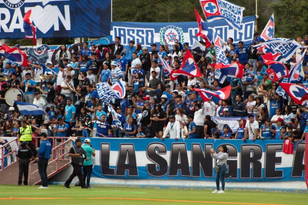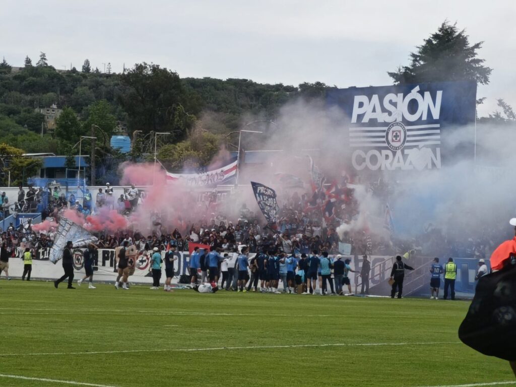 En medio de un estadio prácticamente llenó, los jugadores del Cruz Azul fueron arropados por la afición hidalguense y en todo momento se escucharon los cantos, las porras, los gritos de apoyo y por momentos tanto la porra como el cielo se llenaron de bengalas de colores, rojas, blancas y azules.