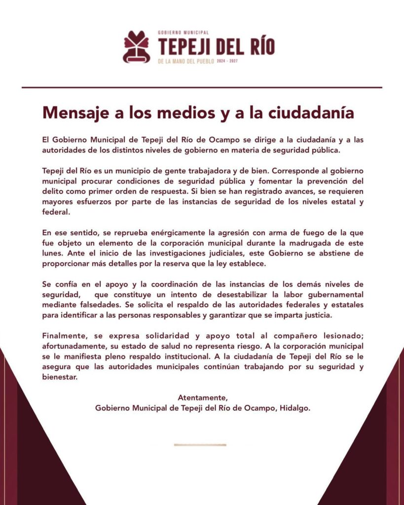 A través de un comunicado, el Gobierno Municipal de Tepeji del Río condenó enérgicamente la agresión contra el elemento policial, destacando su compromiso con la seguridad pública y la prevención del delito. Asimismo, hizo un llamado a las autoridades estatales y federales para reforzar la coordinación en materia de seguridad, con el fin de esclarecer los hechos y llevar ante la justicia a los responsables.