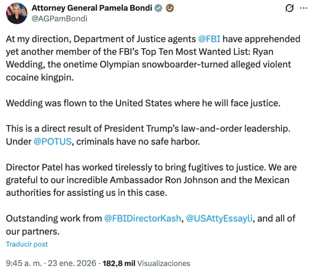 Wedding, de 44 años, compitió por Canadá en Salt Lake City 2002. Sin embargo, su descenso al infierno criminal lo llevó a traficar cientos de millones de dólares en droga. La Fiscal General de EE.UU., Pamela Bondi, celebró la captura del “presunto capo violento de la cocaína”, agradeciendo a las autoridades mexicanas por facilitar su traslado inmediato ante la justicia estadounidense.