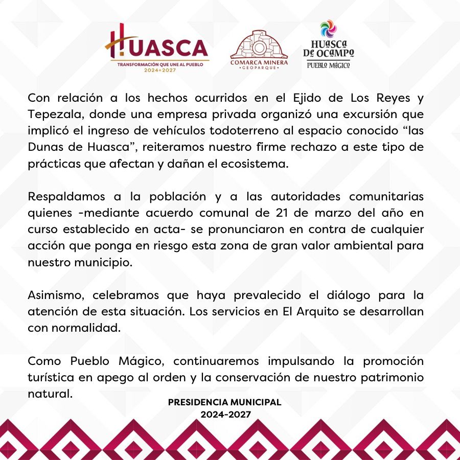 Los recientes daños en Dunas de Huasca provocaron inconformidad entre ejidatarios y autoridades comunitarias, luego de que vehículos todoterreno ingresaran a esta zona natural ubicada en Huasca de Ocampo.