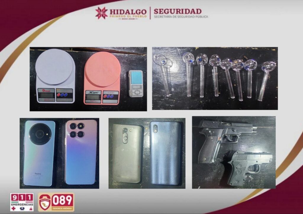 Además, localizaron tres básculas grameras, ocho pipas de cristal, bolsas de sellado hermético para dosificación, dos armas hechizas y equipos de telefonía supuestamente utilizados para la distribución de drogas.
