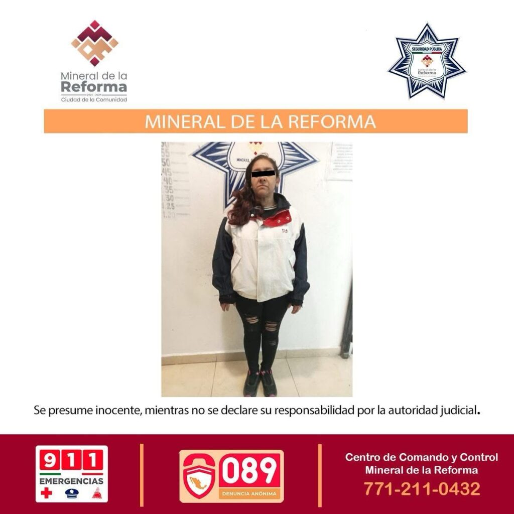 La Secretaría de Seguridad Pública de Mineral de la Reforma, dio a conocer la detención de una mujer señalada por allanamiento de morada ocurrido en el fraccionamiento Rinconadas del Venado.