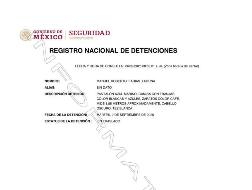 El Registro Nacional de Detenciones de la SSPC señala que Manuel Roberto Farías Laguna, fue detenido vistiendo una camisa con franjas color blancas y azules, zapatos color café. Mide 1.85 metros aproximadamente; tiene el cabello oscuro y tez blanca. Su aprehensión se registró el pasado 2 septiembre.