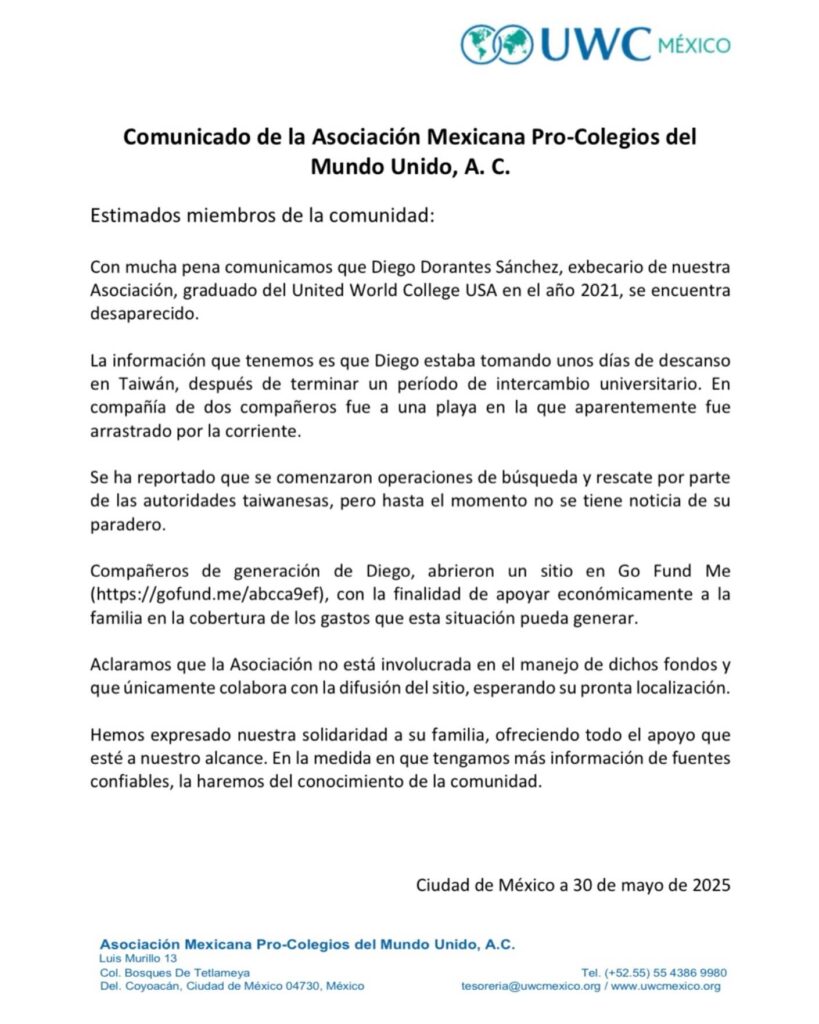 Sobre este caso, la Asociación Mexicana Pro Colegios del Mundo Unido, A.C, donde Diego es exbecario, informó a través de un comunicado que el joven originario de Ixmiquilpan, estaba tomando unos días de descanso en Taiwán, luego de termianar su periodo de intercambio universitario.