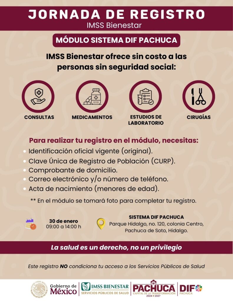 La jornada se llevará a cabo el viernes 30 de enero, de 09:00 a 14:00 horas, en las instalaciones del Sistema DIF Pachuca, ubicadas en Parque Hidalgo no. 120, colonia Centro, Pachuca de Soto, Hidalgo.