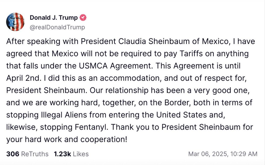 A través de la red social Truth, el mandatario estadunidense indicó que los productos mexicanos del T-MEC estarán exentos de su política de aranceles hasta el 2 de abril.
