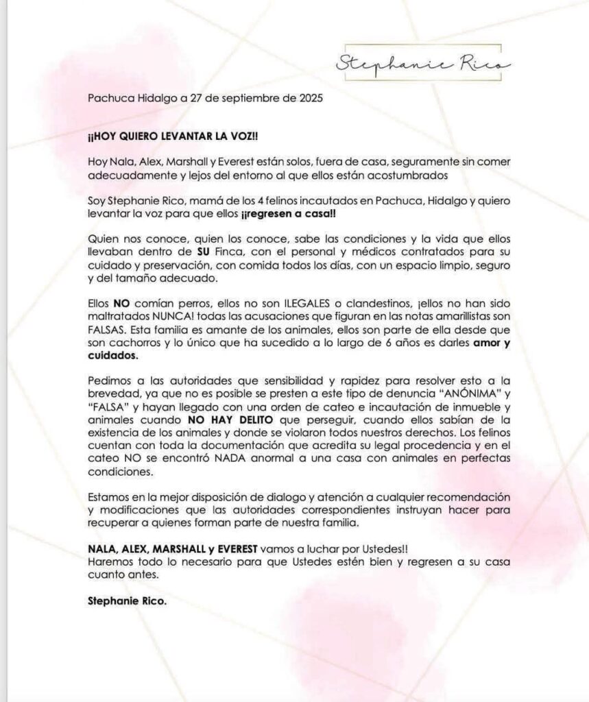 A través del texto, Sthepanie Rico hizo un llamado a las autoridades para que los felinos regresen a su casa, asegurando que quienes los conocen saben las condiciones y tipo de vida que los felinos llevaban en su finca, asegurando que cuentan con el personal adecuado, además de médicos contratados para su cuidado y preservación.