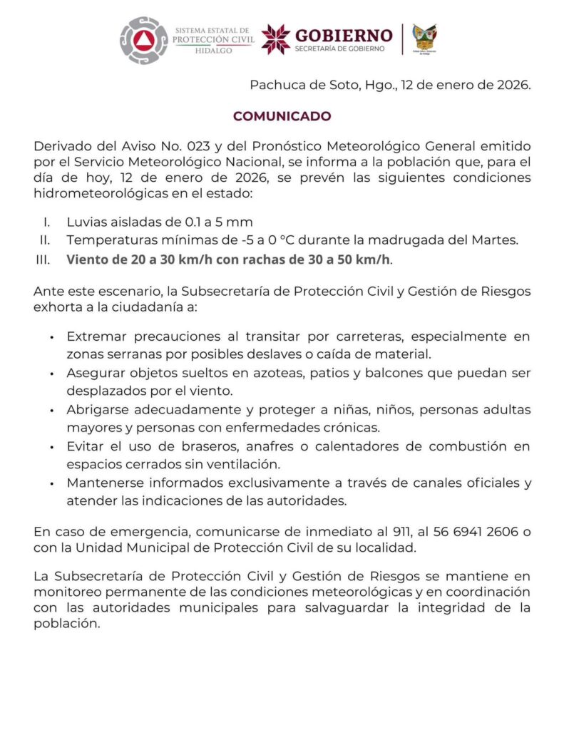 Las condiciones meteorológicas en Hidalgo para este lunes 12 de enero estarán influenciadas por bajas temperaturas, lluvias aisladas y rachas de viento, de acuerdo con el más reciente aviso emitido por autoridades estatales de Protección Civil.