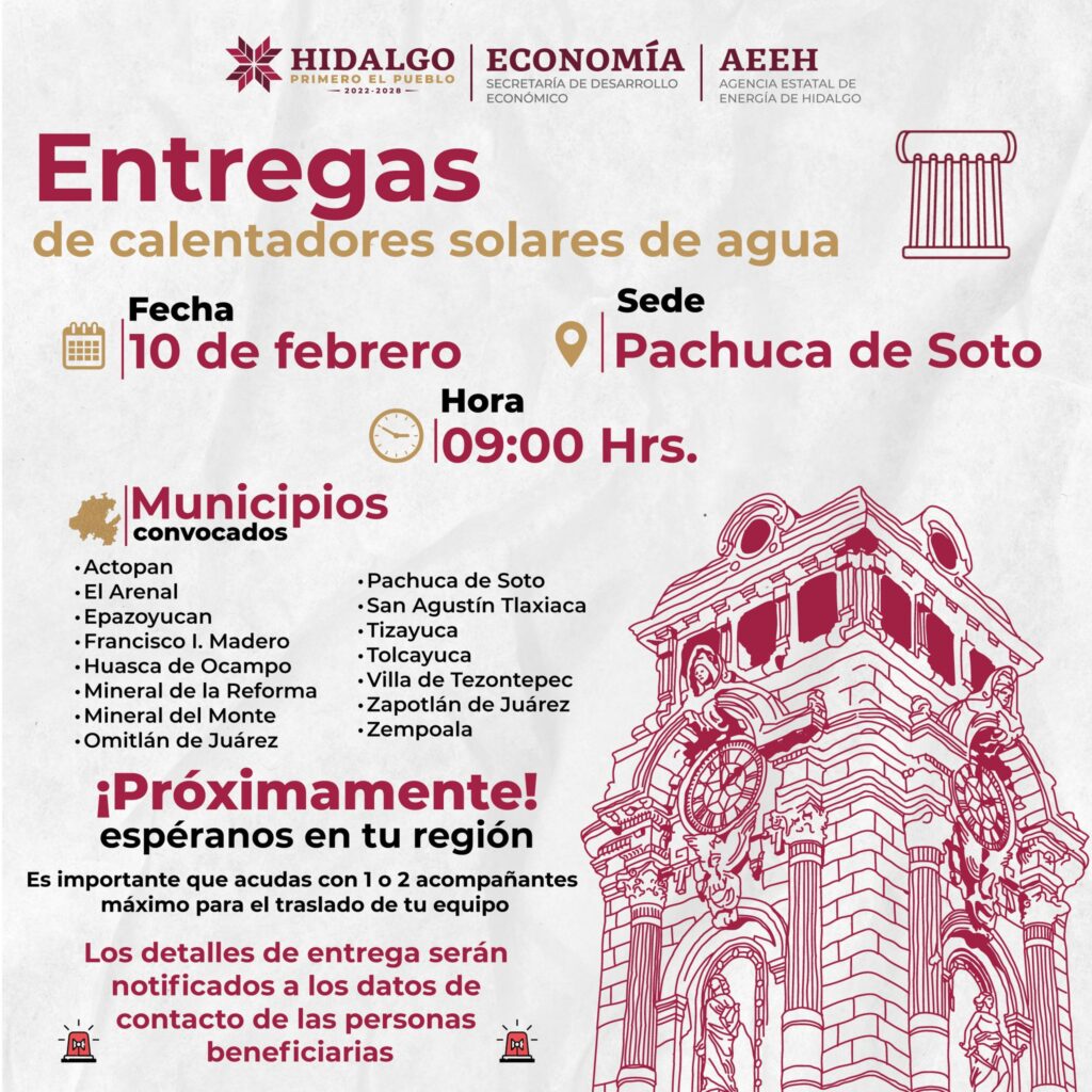 Los calentadores solares se entregarán el próximo 10 de febrero a las 9:00 horas; en Pachuca. La convocatoria destaca que los beneficiarios acudan con 1 o máximo 2 acompañantes para trasladar el calentador solar.