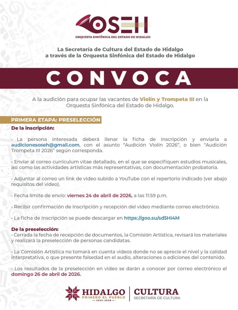 La Orquesta Sinfónica del Estado de Hidalgo abrió su convocatoria 2026 para integrar nuevos músicos a sus filas, dirigida a intérpretes interesados en formar parte de una de las agrupaciones más representativas de Hidalgo.
