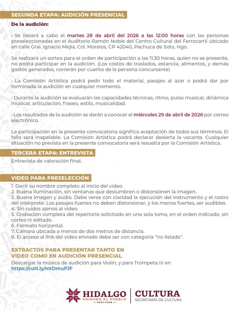 Las personas interesadas deberán consultar las bases completas, donde se especifican los requisitos, materiales solicitados y el procedimiento de audición, el cual permitirá seleccionar a quienes se integrarán a la agrupación.