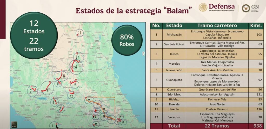 La Guardia Nacional presentó datos que muestran resultados positivos en varias regiones, incluido Hidalgo, específicamente en el tramo Pachuca-Tula. La estrategia Balam se enfoca en 12 estados de la República y 22 tramos carreteros que concentran el 80 por ciento del robo de vehículos de carga en el país.