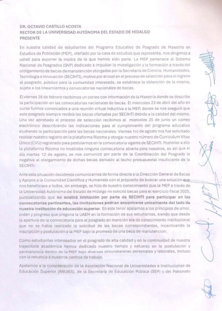 Ante esta respuesta, los estudiantes contactaron directamente a la SECIHTI, donde obtuvieron una versión distinta: no existía impedimento presupuestal alguno para otorgar las becas, pero la UAEH no gestionó el trámite necesario dentro del plazo estipulado, dejando a los alumnos sin el apoyo prometido.