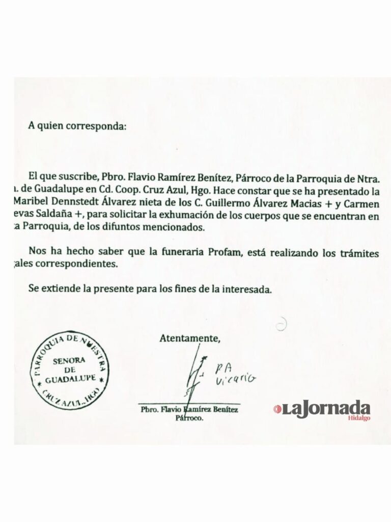 A través de un documento, del cual La Jornada Hidalgo tiene copia, el presbítero Flavio Ramírez Benitez, párroco de la Parroquia de Nuestra Señora de Guadalupe, ubicada en Ciudad Cooperativa La Cruz Azul, informó de la exhumación de los restos del exgerente general de la Cooperativa La Cruz Azul y su esposa.