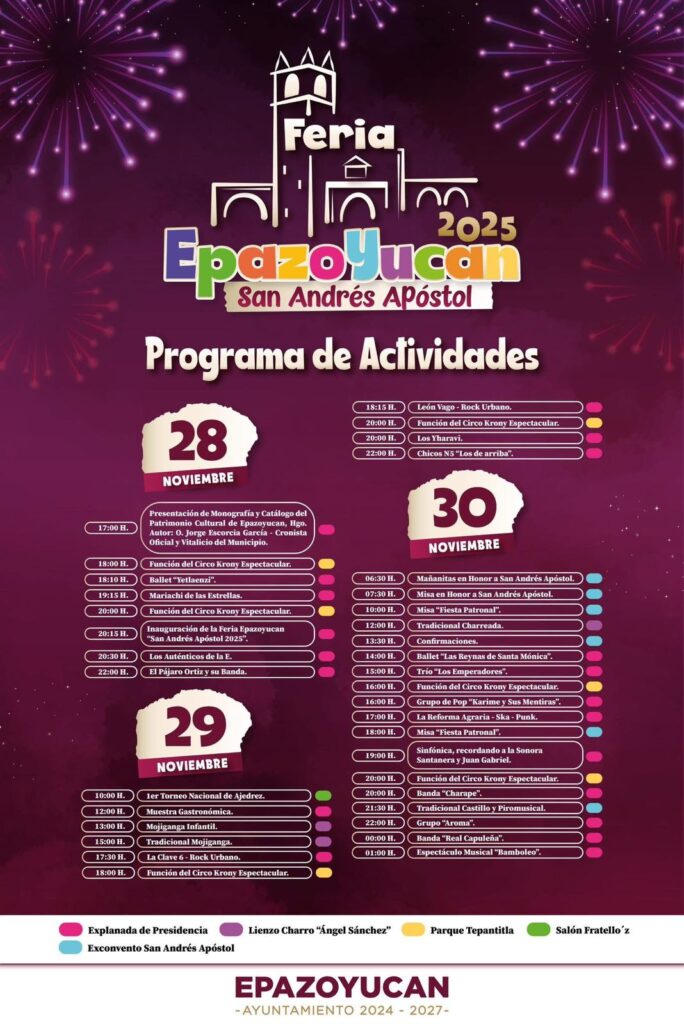 El alcalde señaló que, aunque la fiesta patronal es el 30 de noviembre, las actividades iniciarán desde este viernes para incentivar la visita al municipio y ofrecer alternativas de diversión para todas las edades. También se presentará la nueva Monografía y Catálogo del Patrimonio Cultural de Epazoyucan, elaborada por el cronista oficial y vitalicio, Jorge Escorcia García, cuya venta permitirá difundir la historia local entre jóvenes y niñas y niños.